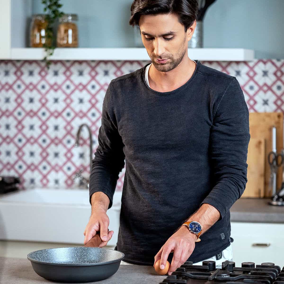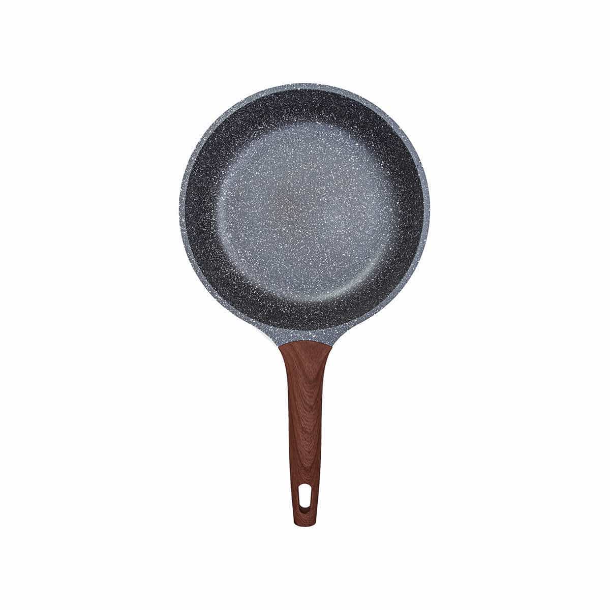 Το τηγάνι της σειράς Stone είναι κατασκευασμένο από χυτό αλουμίνιο και διαθέτει εξωτερική επίστρωση όψης πέτρας, με πιστοποίηση Cookmark και αντικολλητικές ιδιότητες. Περιλαμβάνει εργονομική και αντιολισθητική λαβή βακελίτη που παραμένει κρύα κατά το μαγείρεμα.