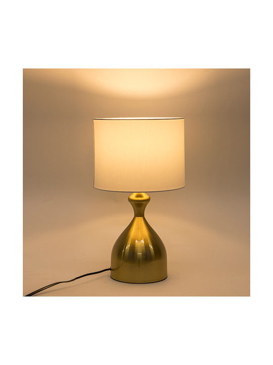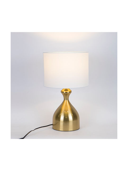 Φωτιστικό επιτραπέζιο με μεταλι⅘ή χρυσή βάση και υφασμάτινο λευκό καπέλο από την ESTHETI.